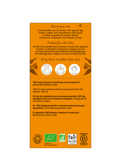 100% organically grown and ethically sourced ingredients: Black tea blend (Putharjhora Dooars, Darjeeling late flush, Panshagarh). 100% fair trade ingredients certified according to the Fair for Life Standard – black tea.