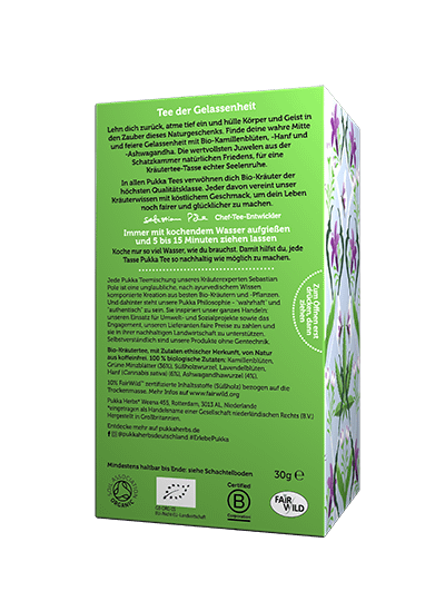 Preparation: Always pour boiling water over it and leave to infuse for 5 to 15 minutes. Boil only as much water as you need. This helps to make each cup of Pukka Tea as long-lasting as possible.