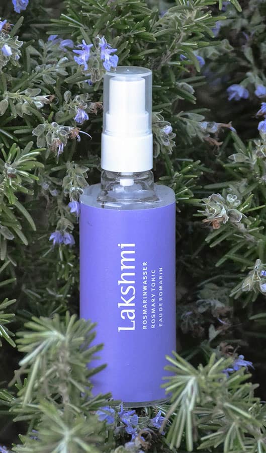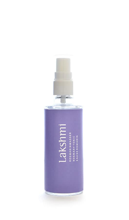 Eau de romarin de Lakshmi Hydrolat biologique L’eau de romarin de Lakshmi est un hydrolat obtenu lors de la distillation à la vapeur d’eau de l’huile de romarin portugais. Elle contient de nombreux composants parfumés frais de l’huile de romarin. Son parfum exceptionnellement rafraîchissant revigore convenablement la peau du visage. Le romarin est connu pour son effet raffermissant et nourrissant et convient bien aux peaux impures et grasses (également pour l’acné). Il peut également être utilisé pour le cuir chevelu afin de stimuler la croissance des cheveux et améliorer les pellicules et les cheveux gras. Les propriétés revigorantes du romarin favorisent la concentration, renforcent notre confiance en nous et réduisent le “pitta”.