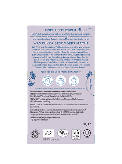 Préparation: Versez toujours de l’eau bouillante dessus et laissez-la infuser pendant 5 à 15 minutes. Ne faites bouillir que la quantité d’eau dont vous avez besoin. Cela contribue à rendre chaque tasse de Pukka Tea aussi durable que possible.