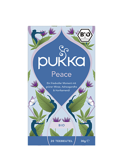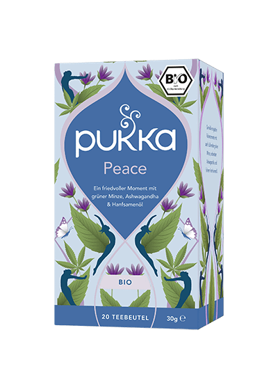 Pukka Peace The biologique Thé de la sérénité. Penchez-vous, prenez une grande respiration et enveloppez votre corps et votre âme dans la magie de ce don de la nature. Trouvez votre vrai centre et célébrez la sérénité avec des fleurs de camomille, du chanvre et de l’ashwagandha organiques. Les joyaux les plus précieux du trésor de la paix naturelle, pour une tasse de tisane de véritable tranquillité d’esprit. Tisane biologique, avec des ingrédients d’origine éthique, naturellement décaféinée. 100% d’ingrédients biologiques : Fleurs de camomille, feuilles de menthe verte (36%), racine de réglisse, fleurs de lavande, chanvre (Cannabis sativa) (6%), racine d’ashwagandha (4%). 10% FairWild™ Ingrédients certifié (réglisse) à base de matière sèche.