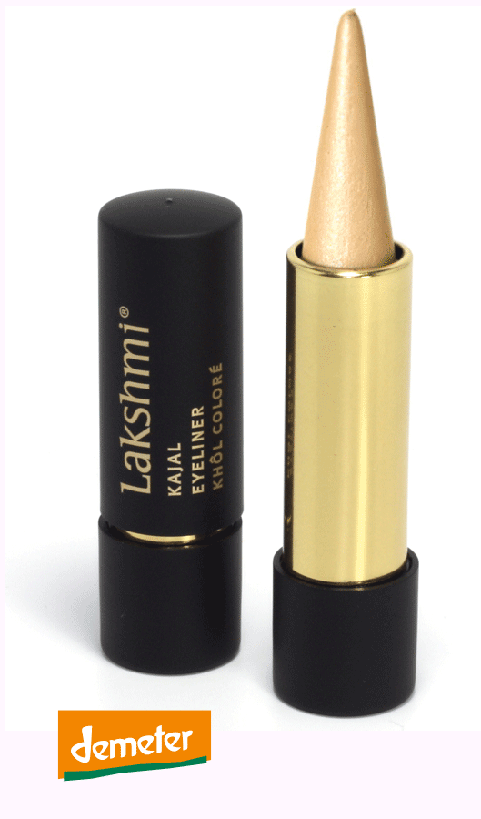 Lakshmi Farbkajal Goldstaub biologisch Demeter Das neue Gold für 2021! Großflächig aufgetragen für ein dramatisches Abend Make-up oder dezent akzentuierend für einen strahlenden Glanz. In Kombination mit dunklen Farben, besonders mit Moosgrün, schafft es eine geheimnisvolle Wirkung. Neben dem Ghee, sind es natürliche Öle, Bienenwachs und Kohlenstoff, die kühlend und klärend auf die Augen wirken und sie zum Strahlen bringen. Ayurvedische Kajal von Lakshmi enthalten keinerlei Konservierungsstoffe, ihr Anteil an Inhaltsstoffen aus biologischer und Biodynamischer Landwirtschaft ist zertifiziert und wird regelmäßig von demeter überprüft. Farbkajal Inhaltsstoffe: Ayurvedisches Ghee, zertifiziertes Wollfett, Bienenwachs, Karnauba Wachs, Kokosnussöl, Rizinusöl, Mandelöl, Kampfer, Aloe Vera Frischblätter, Augentrost und mineralische Farbpigmente