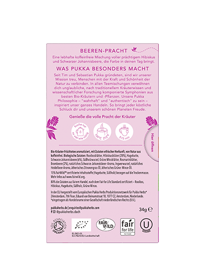 Zubereitung: Immer mit kochendem Wasser aufgiessen und 5 bis 15 Minuten ziehen lassen. Koche nur so viel Wasser, wie du brauchst. Damit hilfst du, jede Tasse Pukka Tee so nachhaltig wie möglich zu machen.