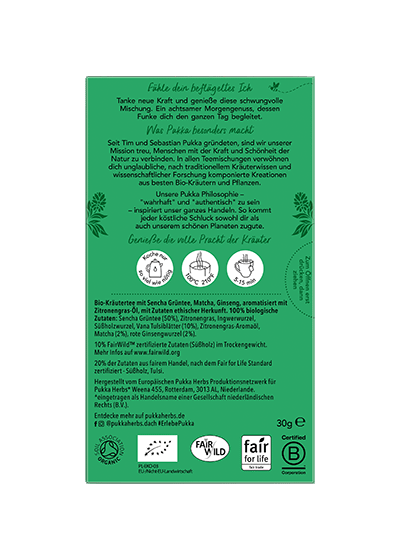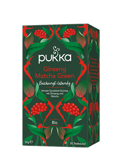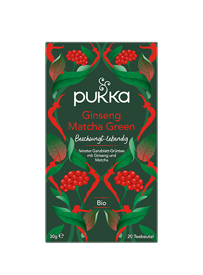 Pukka Ginseng Matcha Green Bio-Kräutertee: Grüntee-Freude mit Rotem Ginseng und feinstem Matcha Neue Kraft tanken. Gehe beschwingter durch den Tag, mit Zitronengras und Ginseng. Smaragdgrüner Matcha und Sencha Grüntee sind die Grundlage, auf der diese verführerischen Kopfnoten ihr lebhaftes Aroma entfalten. Ein achtsamer Morgengenuss, dessen Funke dich den ganzen Tag begleitet. Zubereitung: Immer mit kochendem Wasser aufgiessen und 5 bis 15 Minuten ziehen lassen. Koche nur so viel Wasser, wie du brauchst. Damit hilfst du, jede Tasse Pukka Tee so nachhaltig wie möglich zu machen. Bio-Kräutertee mit Sencha Grüntee, Matcha, Ginseng und Zitronengras-Öl, mit Zutaten ethischer Herkunft. 100% biologische Zutaten: Jeju Island Sencha Grüntee (50%), Zitronengras, Ingwerwurzel, Süssholzwurzel, Vana Tulsiblätter, Zitronengras-Aromaöl, Jeju Island Emerald Matcha (2%), rote Ginsengwurzel (2%).