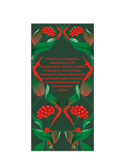 Neue Kraft tanken. Gehe beschwingter durch den Tag, mit Zitronengras und Ginseng. Smaragdgrüner Matcha und Sencha Grüntee sind die Grundlage, auf der diese verführerischen Kopfnoten ihr lebhaftes Aroma entfalten. Ein achtsamer Morgengenuss, dessen Funke dich den ganzen Tag begleitet.