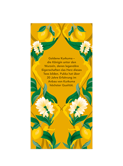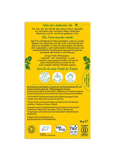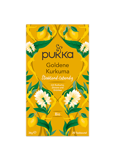 Pukka Goldene Kurkuma Tee Bio-Kräutertee: Goldene Mischung aus feinster Kurkuma, spritziger Zitrone & Grüntee Goldenes Leuchtfeuer. Goldene Kurkuma – die Königin der Kräuter, deren legendäre Eigenschaften das Herz dieses Tees bilden. Mit dem Kick von Zitrone, aromatischem Kardamom und wertvollem Bio-Grüntee feiert sein Rezept die Würde des Lebens. Geniesse ihn und spüre das Leuchten dieser köstlichen Mischung und ihr strahlend-goldenes Licht. Zubereitung: Immer mit kochendem Wasser aufgiessen und 5 bis 15 Minuten ziehen lassen. Koche nur so viel Wasser, wie du brauchst. Damit hilfst du, jede Tasse Pukka Tee so nachhaltig wie möglich zu machen. Bio-Kräutertee mit Grüntee und Zitronenschalenöl, mit Zutaten ethischer Herkunft. 100% biologische Zutaten: Kurkumawurzel (40%), Grüntee (20%), Süssholzwurzel, Kardamomkapseln, Zitronenstücke (6%), Zitronenverbenenblätter, Zitronenschalen-Aromaöl. 12% FairWild™ zertifizierte Inhaltsstoffe (Süssholz) bezogen auf die Trockenmasse. 72% Zutaten aus fairem Handel, nach dem Fair for Life Standard zertifiziert – Kurkuma, Grüntee, Süssholz.