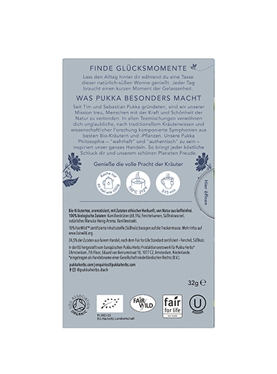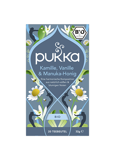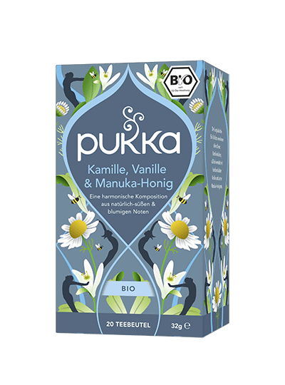 Pukka Kamille Vanille & Manuka-Honig Bio-Kräutertee: Glückseliges Bad in Gelassenheit Glückseligkeit für dich. Immer auf der Spur, immer in Bewegung – Zeit, das Leben zu entschleunigen und bei einem Tässchen Bio-Tee zu entspannen. Exotisch-süsse Vanille, wertvoller Manuka-Honig und köstlich-milde Kamille: Kostbarste Schätze der Natur, vereint für Momente glückseliger Gelassenheit. Zubereitung: Immer mit kochendem Wasser aufgiessen und 5 bis 15 Minuten ziehen lassen. Koche nur so viel Wasser, wie du brauchst. Damit hilfst du, jede Tasse Pukka Tee so nachhaltig wie möglich zu machen. Bio-Kräutertee mit Vanille-Extrakt, mit Zutaten ethischer Herkunft, von Natur aus koffeinfrei. 100% biologische Zutaten: Kamillenblüten (68%), Fenchelsamen (Süss- und Wildfenchelsamen), Süssholzwurzel, Manuka-Honig, Vanille-Aromaextrakt, Vanilleschoten. 10% FairWildTM zertifizierte Inhaltsstoffe (Süssholz) bezogen auf die Trockenmasse. 20% Zutaten aus fairem Handel, nach dem Fair for Life Standard zertifiziert – Süssfenchel, Süssholz.