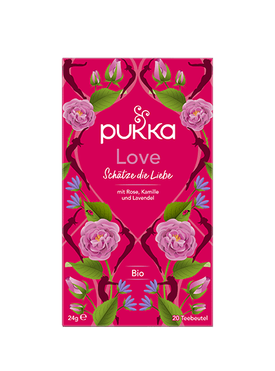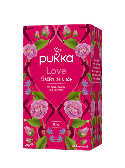 Pukka Love bio Tee Bio-Kräutertee: Herzerwärmende Umarmung von Rose, Kamille & Lavendel Ich liebe dich. Einfach aus Blüten gemacht – dieser Tee ist eine Liebesgabe. Gebe dich einer Tasse der Fürsorge hin, in der Rose, Lavendel, Kamille und FairWild™-Holunder- und -Lindenblüten jeden Schluck bereichern. Eine zärtliche Weise, jeden freudvollen, schönen Tag etwas Liebe zu schenken. Zubereitung: Immer mit kochendem Wasser aufgiessen und 5 bis 15 Minuten ziehen lassen. Koche nur so viel Wasser, wie du brauchst. Damit hilfst du, jede Tasse Pukka Tee so nachhaltig wie möglich zu machen. Bio-Kräutertee, mit Zutaten ethischer Herkunft, von Natur aus koffeinfrei. 100% biologische Zutaten: Kamillenblüten (25%), Lindenblüten, Holunderblüten, Ringelblumenblüten, Süssholzwurzel, Rosenblüten (5%), Lavendelblüten (5%). 50% FairWild™ zertifizierte Inhaltsstoffe (Lindenblüten, Holunderblüten, Süssholz) bezogen auf die Trockenmasse. 50% Zutaten aus fairem Handel, nach dem Fair for Life Standard zertifiziert – Lindenblüten, Holunderblüten, Süssholz.