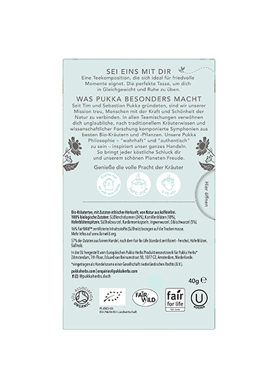 Zubereitung: Immer mit kochendem Wasser aufgiessen und 5 bis 15 Minuten ziehen lassen. Koche nur so viel Wasser, wie du brauchst. Damit hilfst du, jede Tasse Pukka Tee so nachhaltig wie möglich zu machen.