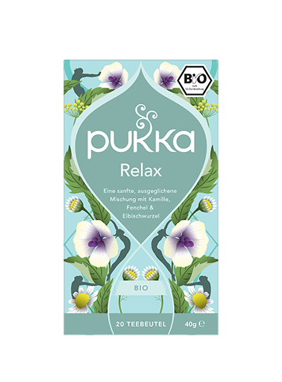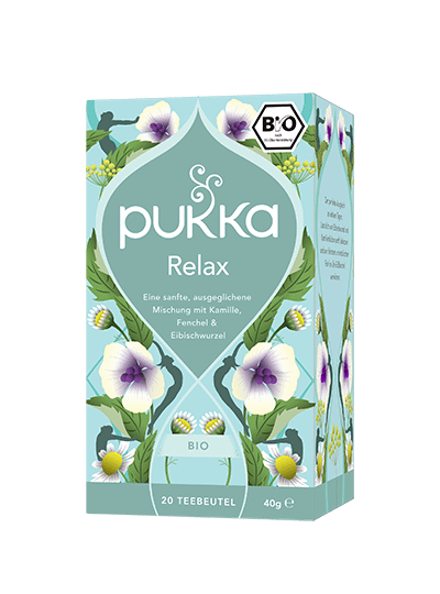 Pukka Relax bio Tee Bio-Kräutertee: Friedvolle Fusion aus Kamille, Fenchel & Eibischwurzel Sei eins mit dir. Pflege deinen inneren Frieden: Hier kommt eine perfekt ausbalancierte Mischung, die stille Wasser anspricht. Bade in der Schönheit von Kamillenblüte und der Leichtigkeit von Haferblütenspitze, Fenchelsamen und Eibischwurzel – immer dann, wenn du einen Moment zarter Stille suchst. Zubereitung: Immer mit kochendem Wasser aufgiessen und 5 bis 15 Minuten ziehen lassen. Koche nur so viel Wasser, wie du brauchst. Damit hilfst du, jede Tasse Pukka Tee so nachhaltig wie möglich zu machen. Bio-Kräutertee, mit Zutaten ethischer Herkunft, von Natur aus koffeinfrei. 100% biologische Zutaten: Süssfenchelsamen (24%), Kamillenblüten (18%), Süssholzwurzel, Haferblütenspitzen, Kardamomkapseln, Ingwerwurzel, Eibischwurzel (10%). 16% FairWild™ zertifizierte Inhaltsstoe (Süssholz) bezogen auf die Trockenmasse. 40% Zutaten aus fairem Handel, nach dem Fair for Life Standard zertifiziert – Fenchel, Süssholz.