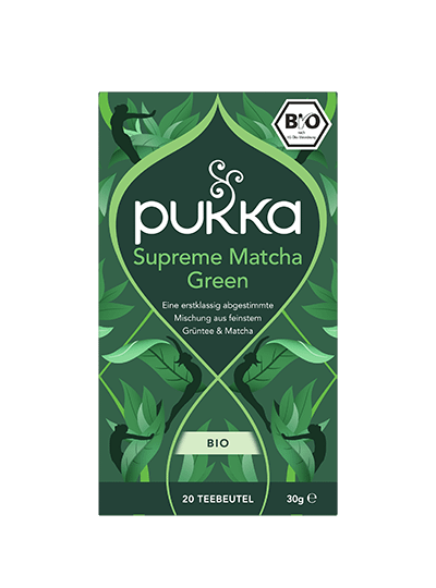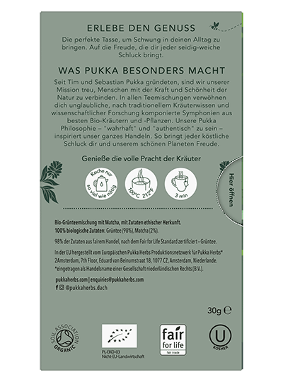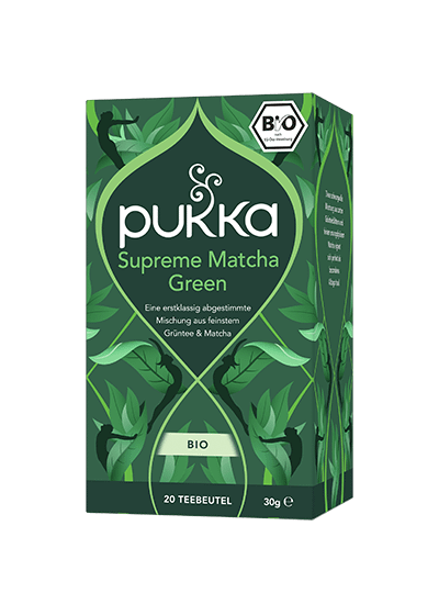 Pukka Matcha Green Tee Bio-Grüntee: Geschmeidig-überragende Mischung aus Grüntee & Matcha Du bist unglaublich. Reiner Grüntee, der den Helden in dir weckt. Smaragdgrüner Matcha – unsere magische Heldenzutat – abgemischt mit drei aussergewöhnlichen Bio-Grüntees. Für Tage, die schon morgens rein, grün und unübertroffen durchstarten. Willkommen in einer völlig neuen Welt. Zubereitung: Immer mit kochendem Wasser aufgiessen und 5 bis 15 Minuten ziehen lassen. Koche nur so viel Wasser, wie du brauchst. Damit hilfst du, jede Tasse Pukka Tee so nachhaltig wie möglich zu machen. Bio-Grünteemischung mit Matcha, mit Zutaten ethischer Herkunft. 100% biologische Zutaten: Sencha Grüntee (34%), Pin Ho Wild Jade Grüntee (32%), Indischer Grüntee (32%), Jeju Island Emerald Matcha (2%). 32% Zutaten aus fairem Handel, nach dem Fair for Life Standard zertifiziert – Pin Ho Wild Jade Grüntee.