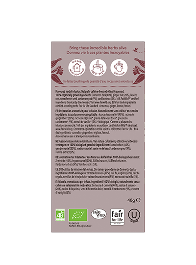 86% Zutaten aus fairem Handel, nach dem Fair for Life Standard zertifiziert – Zimt, Ingwer, Süssholz, Fenchel.