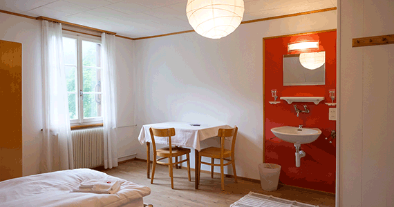 Jedes Zimmer verfügt über einen eigenen Waschbereich mit Lavabo; Toiletten und Duschen befinden sich in beiden Häusern auf der Etage.